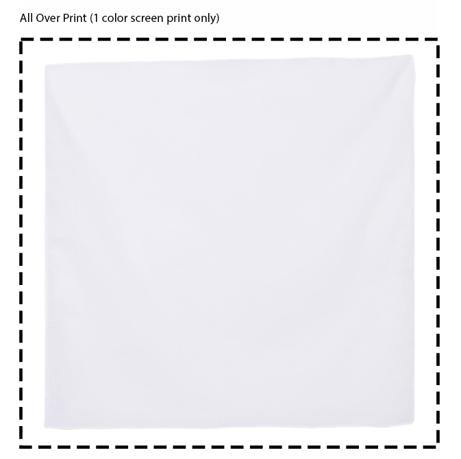 1 color all over screen print only. Bandana has marrowed edges, which may cause imperfections during the print process. Please note bandanas are not perfectly square, so design is recommend to run off of the bandana.