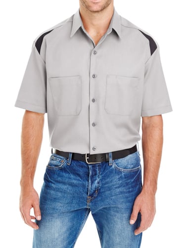 Moisture wicking, FLEX fabric, Easy care stain release, Contrast color block inlays on shoulders, Two chest pockets, left pocket pencil division, 20-line melamine buttons, Square tail design can be worn untucked, Banded collar with topstitching