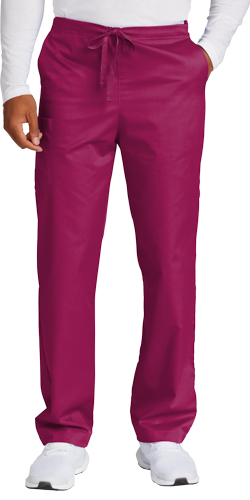 65/35 poly/cotton Mechanical stretch Flat front full drawstring and half-back elastic waistband Front slash pockets Right side cargo pocket Single back pocket Straight leg 33-inch inseam WonderWink heat transfer logo at cargo pocket Classic fit